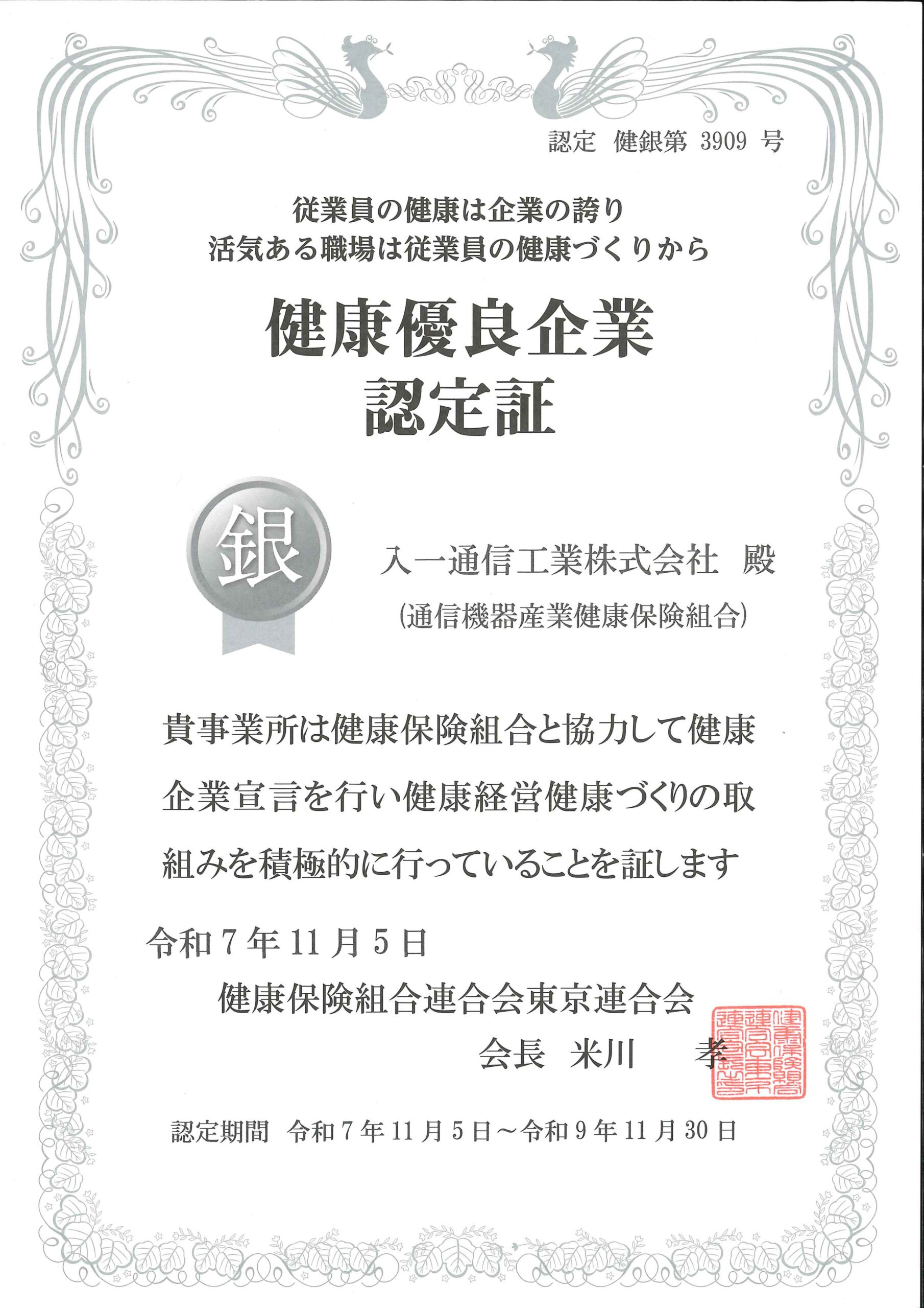 この度、健康保険組合連合会東京連合会による「健康優良企業」の銀の認定を取得いたしました。(2025年11月5日認定)